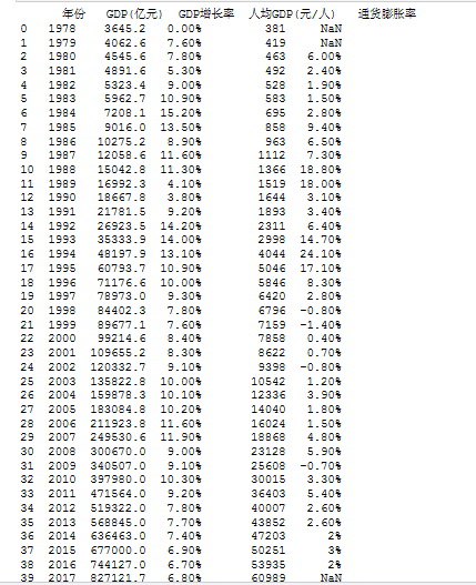 1.按行输出每年GDP数据,表头列名如文件第1行所示。