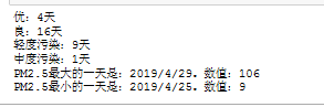 import pandas as pd import numpy as np days_path = open(r"pmi_days.csv") days_data = pd.read_csv(days_path) d = days_data.groupby('质量等级') you = dict([x for x in d])['优'] liang = dict([x for x in d])['良'] qing = dict([x for x in d])['轻度污染'] zhong = dict([x for x in d])['中度污染'] print("优:%d天" % len(you.index), "\n良:%d天" % len(liang.index), "\n轻度污染:%d天" % len(qing.index), "\n中度污染:%d天" % len(zhong.index)) sort_pm25 = days_data.sort_values(by='PM2.5') sort_pm25_2 = sort_pm25.reset_index(drop=True) print("PM2.5最大的一天是:%s。数值:%d" % (sort_pm25_2['日期'][29], sort_pm25_2['PM2.5'][29]), "\nPM2.5最小的一天是:%s。数值:%d" % (sort_pm25_2['日期'][0], sort_pm25_2['PM2.5'][0]))