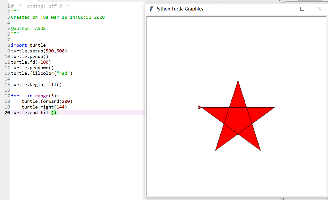 import turtle turtle.setup(500,500) turtle.penup() turtle.fd(-100) turtle.pendown() turtle.fillcolor("red") turtle.begin_fill() for _ in range(5): turtle.forward(200) turtle.right(144) turtle.end_fill()