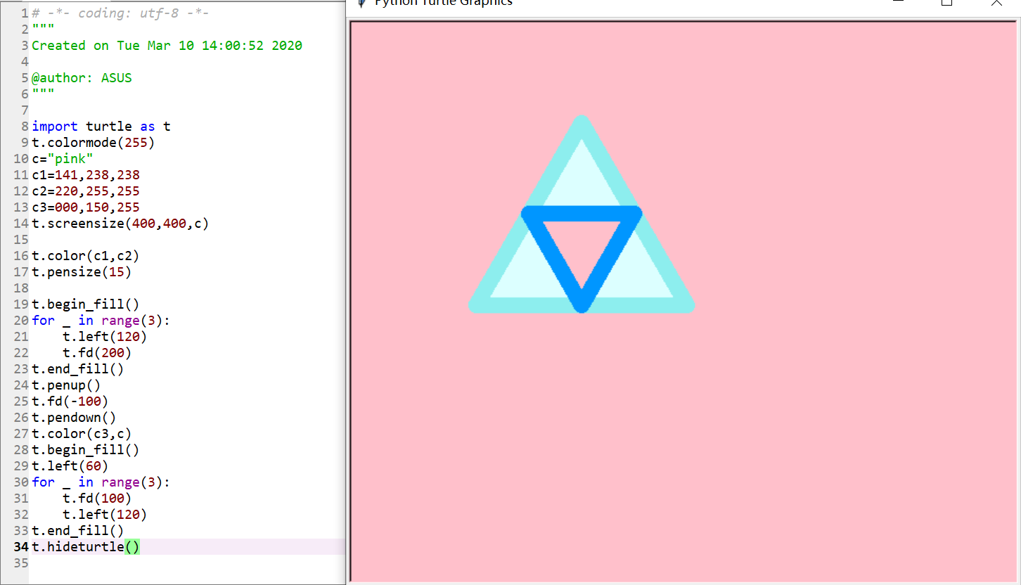import turtle as t t.colormode(255) c="pink" c1=141,238,238 c2=220,255,255 c3=000,150,255 t.screensize(400,400,c) t.color(c1,c2) t.pensize(15) t.begin_fill() for _ in range(3): t.left(120) t.fd(200) t.end_fill() t.penup() t.fd(-100) t.pendown() t.color(c3,c) t.begin_fill() t.left(60) for _ in range(3): t.fd(100) t.left(120) t.end_fill() t.hideturtle()