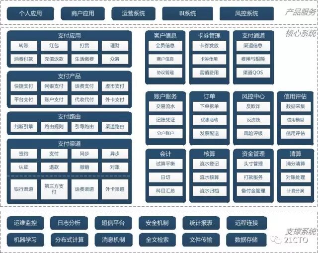 支撑系统、核心系统和服务系统,在每个互联网公司的架构上都是大同小异的,都是必不可少的模块。而支付应用是每个公司根据自己的业务来构建的,各不相同。