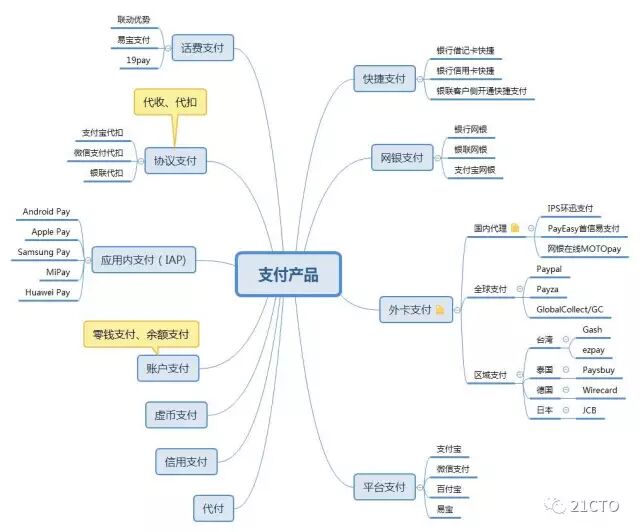 在不同的公司由于接入渠道和应用的差异,对支付产品分类略有不同。综合支付场景和流程,支付产品可以分为如下几类: