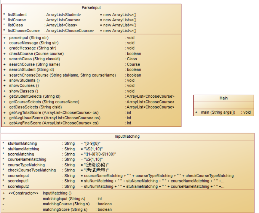 listStudent、listCourse、listClass和listChooseCourse分别保存学生、课程、班级和选课的列表信息。courseMessage方法用于处理课程信息。它从输入字符串中提取课程名、类型和考试类型,并创建一个Course对象。然后通过调用checkCourse方法检查课程是否符合要求,并检查课程列表中是否已经存在该课程,如果满足条件则将课程添加到课程列表中。gradeMessage方法用于处理成绩信息。它从输入字符串中提取学生学号、班级ID、姓名和课程名,并创建一个Student对象。接着通过调用searchClass方法判断班级是否已存在,若不存在则创建一个Class对象并添加到班级列表中。然后再调用searchStudent方法判断学生是否已存在,若不存在则将学生添加到学生列表中。接下来检查课程是否存在,如果不存在则输出课程不存在的信息;如果课程存在,根据考试类型和输入字符串的长度,创建相应的成绩对象(AssessGrade或ExamGrade)并将成绩对象与课程、学生关联形成ChooseCourse对象,最后将ChooseCourse对象添加到选课列表中。