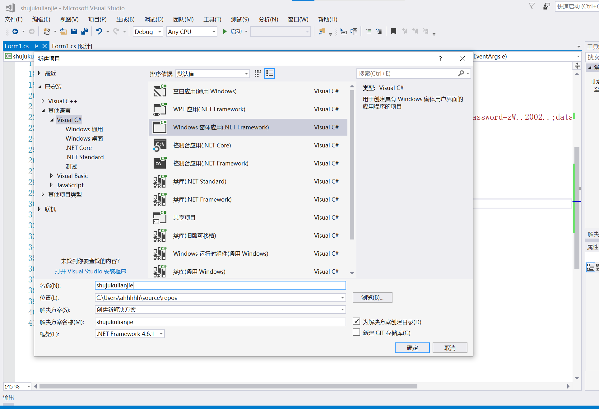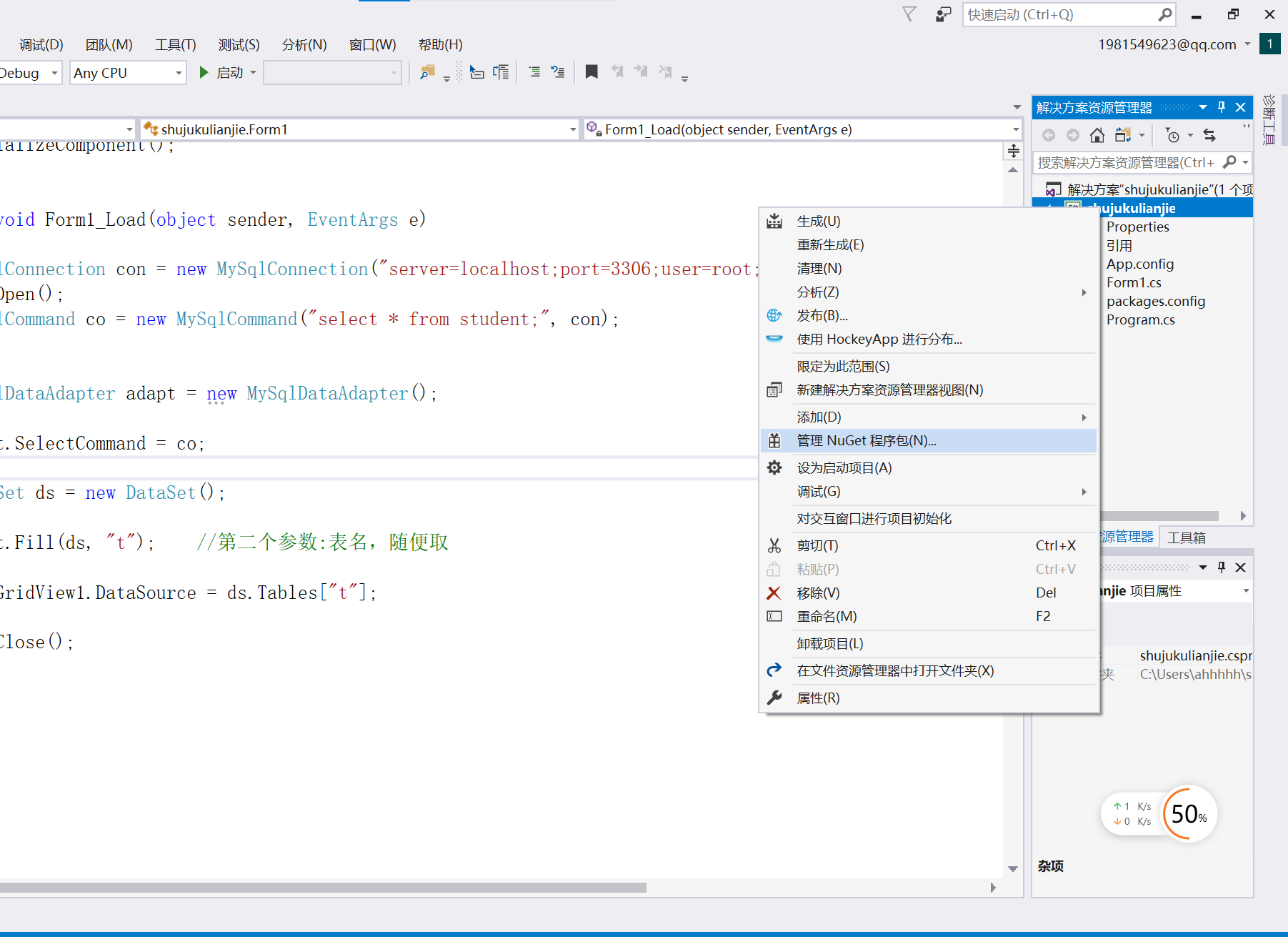 (4)双击window窗体,引入using MySql.Data.MySqlClient;