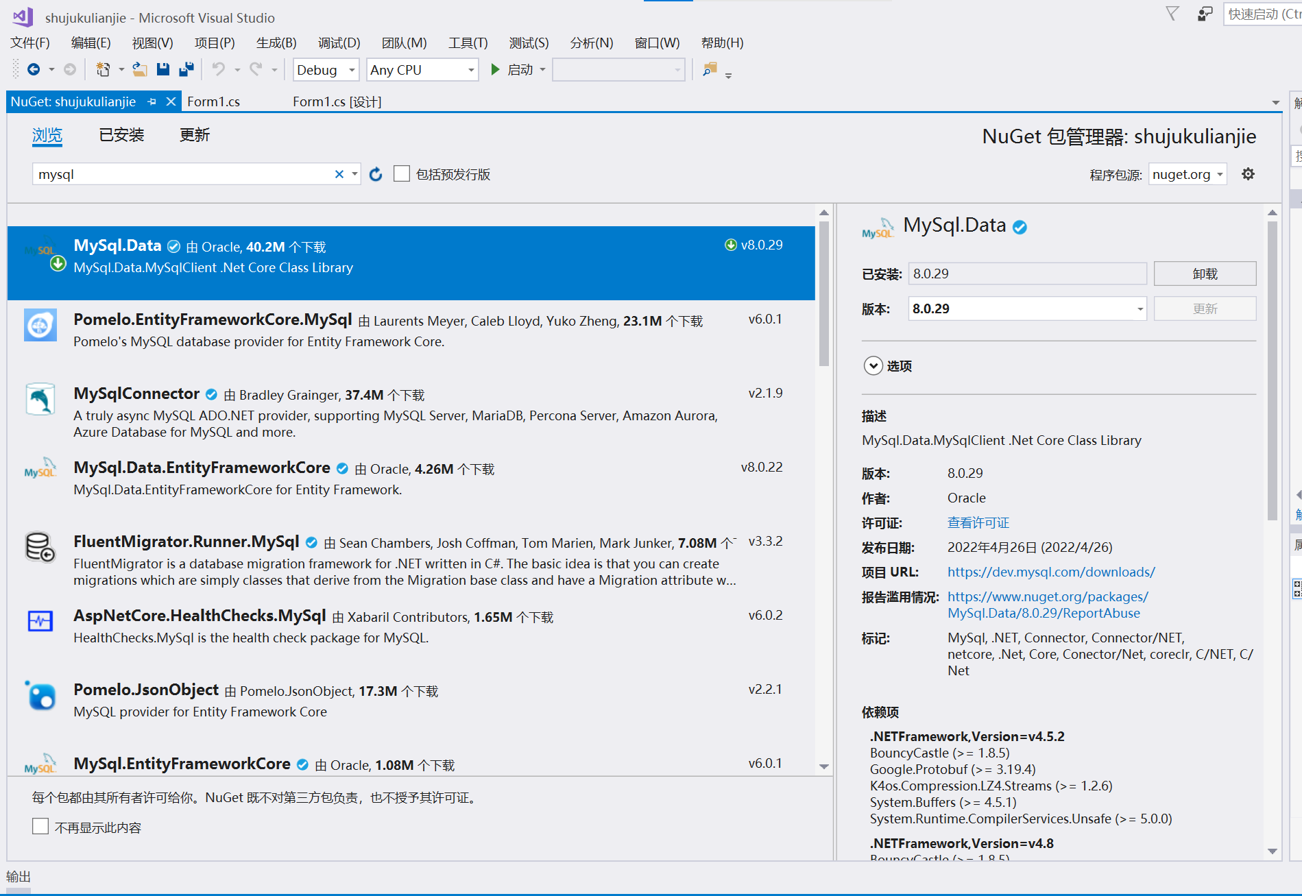 (3)在浏览区搜索mysql.data,安装(如果无法安装,有可能是新建项目时项目的.Net Framework版本和mysql.data的版本不适配,可安装其它版本或新建项目)