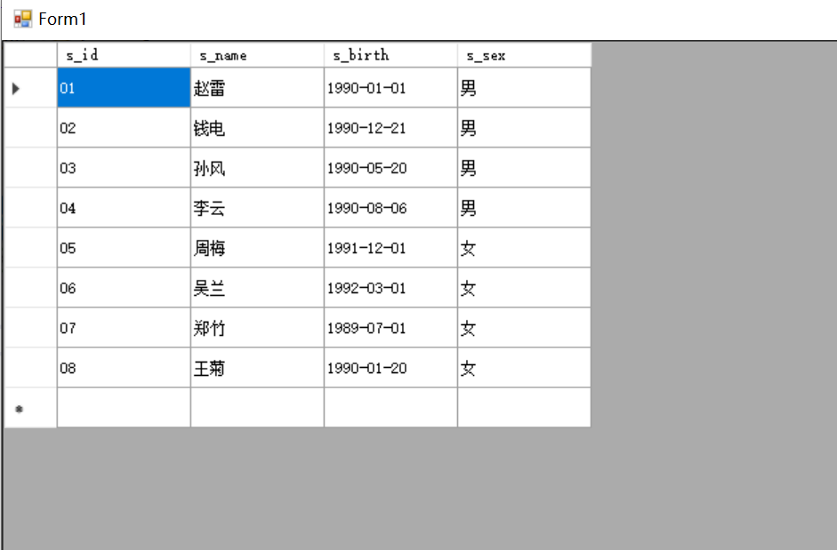 MySqlCommand co = new MySqlCommand("select * from student;", con); MySqlDataAdapter adapt = new MySqlDataAdapter(); adapt.SelectCommand = co; DataSet ds = new DataSet(); adapt.Fill(ds, "t"); //第二个参数:表名,随便取 dataGridView1.DataSource = ds.Tables["t"]; con.Close();