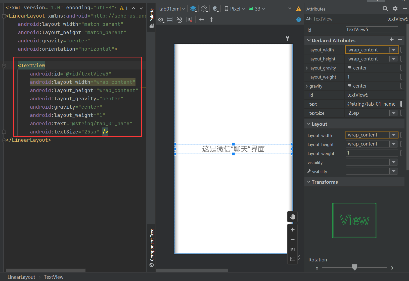 拖动textview控件加入linerlayout中,设置textview的各种属性,如文字居中,文字颜色等,如下: