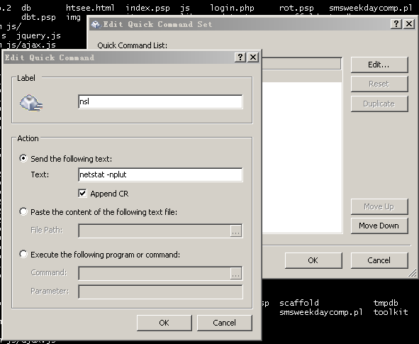 在将其添加好后,将'View'->'Quick Commands'选项打开,这样在xshell的底部就有它们的标签,点击它后将会在终端里执行。