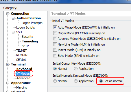 属性页面'Properties'->Terminal->'Initial VT Modes'->'Set as normal'选择即可。