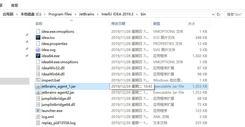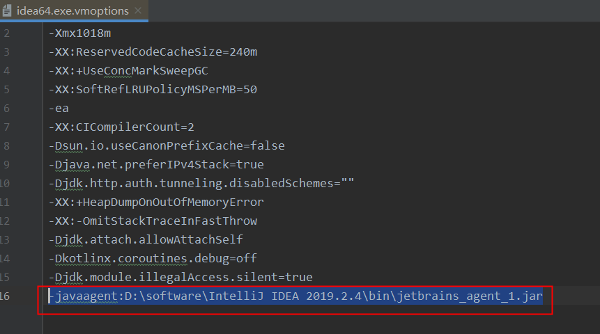 插入这行 -javaagent:D:\software\IntelliJ IDEA 2019.2.4\bin\jetbrains_agent_1.jar