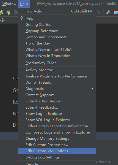2、第二步,先以试用的形式进入idea,然后help -> Edit Custom VM Options