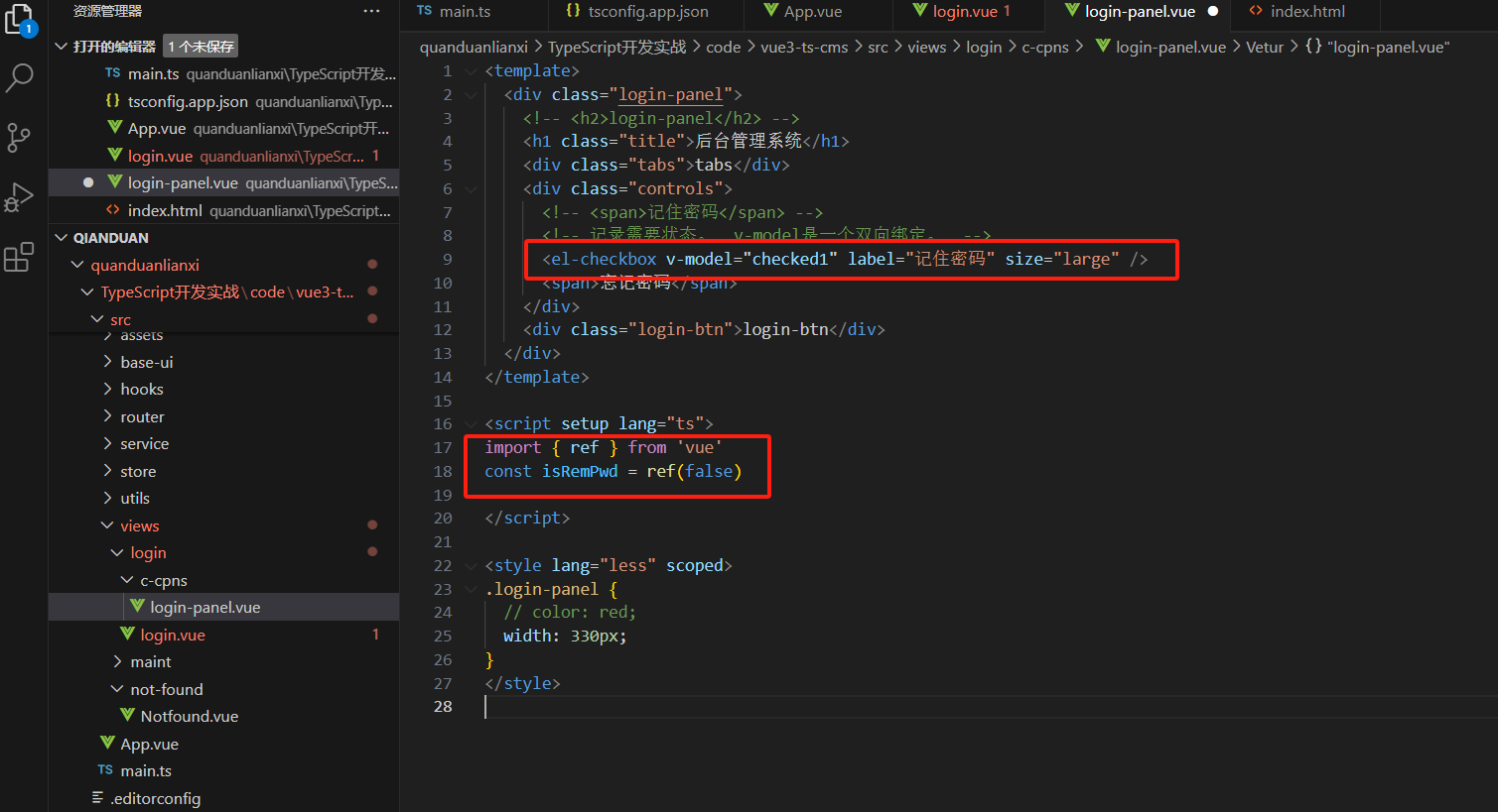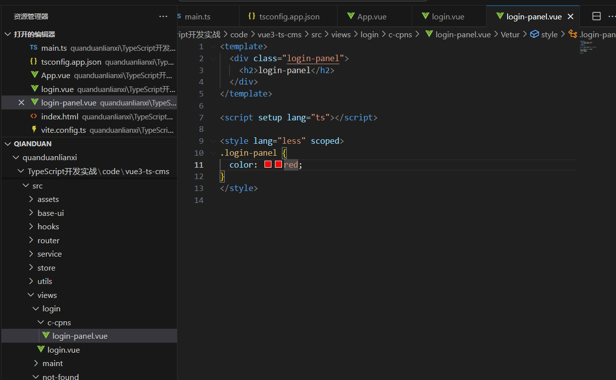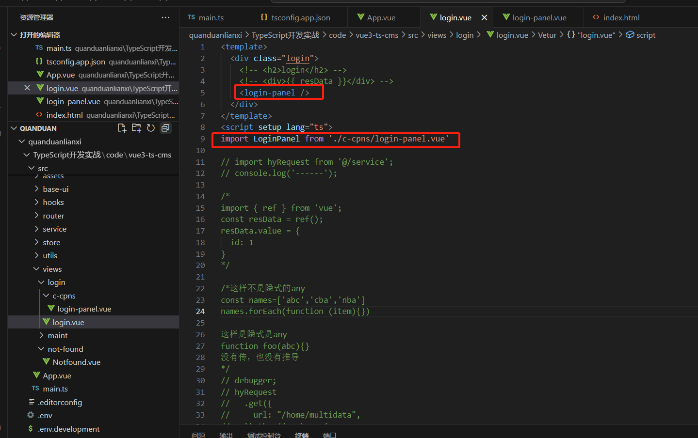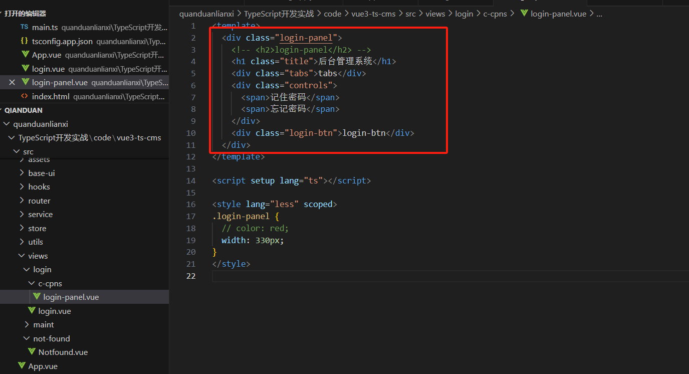 <script setup lang="ts">表示使用了组合式 API 语法糖,并且使用 TypeScript 编写。import LoginPanel from './c-cpns/login-panel.vue'语句将login-panel.vue文件中的LoginPanel组件导入到当前组件中,这样在模板部分就可以使用<login-panel />来渲染该子组件。