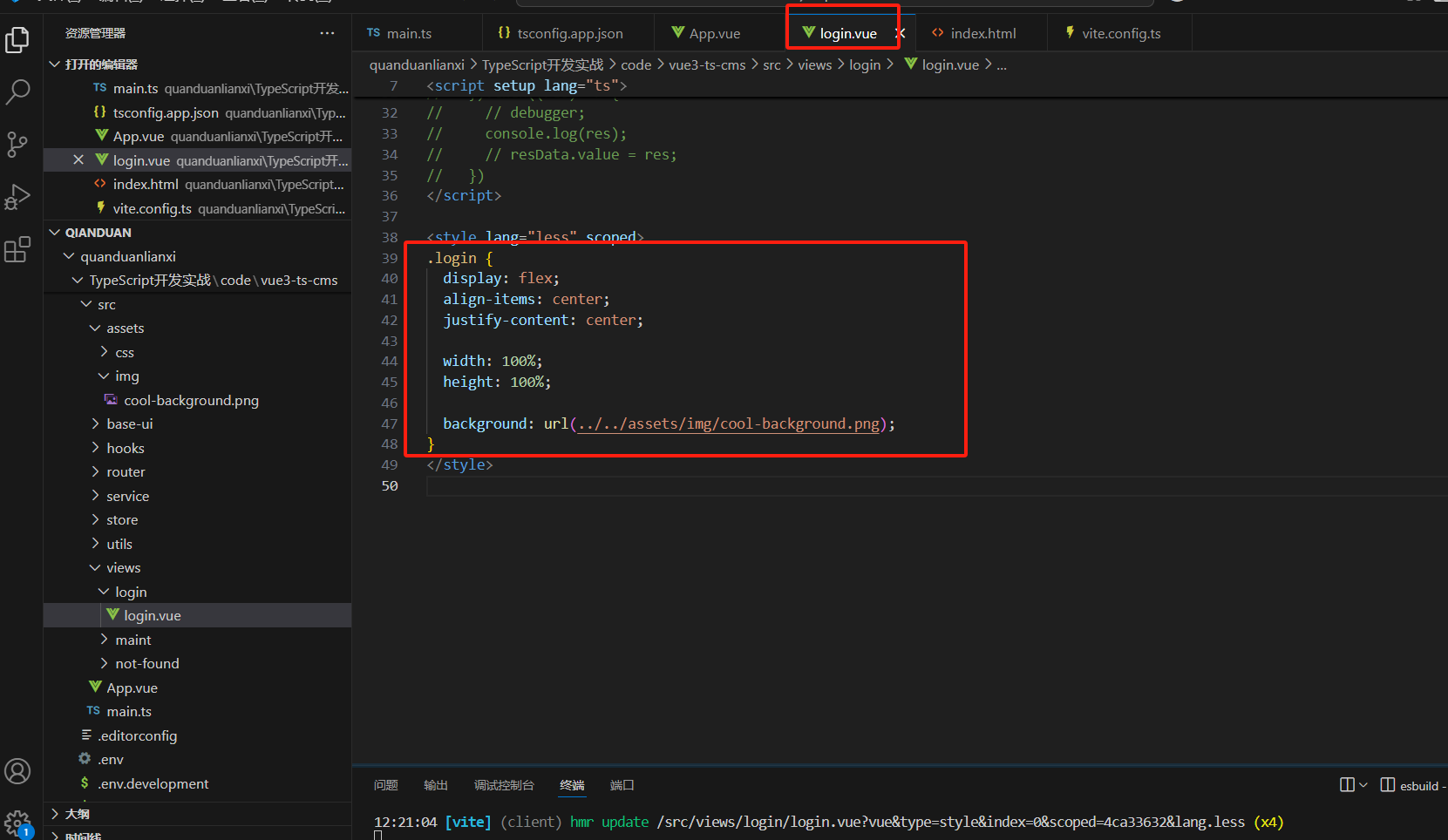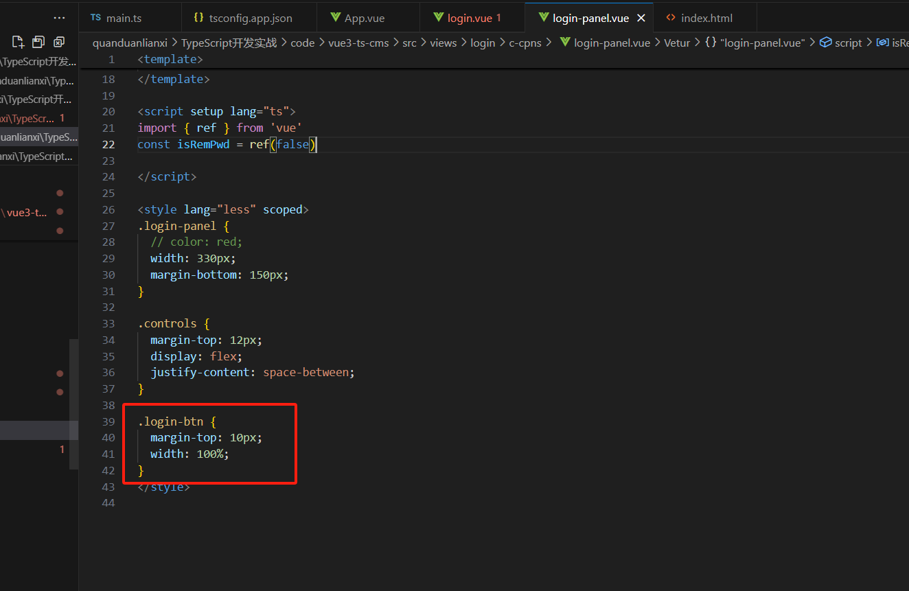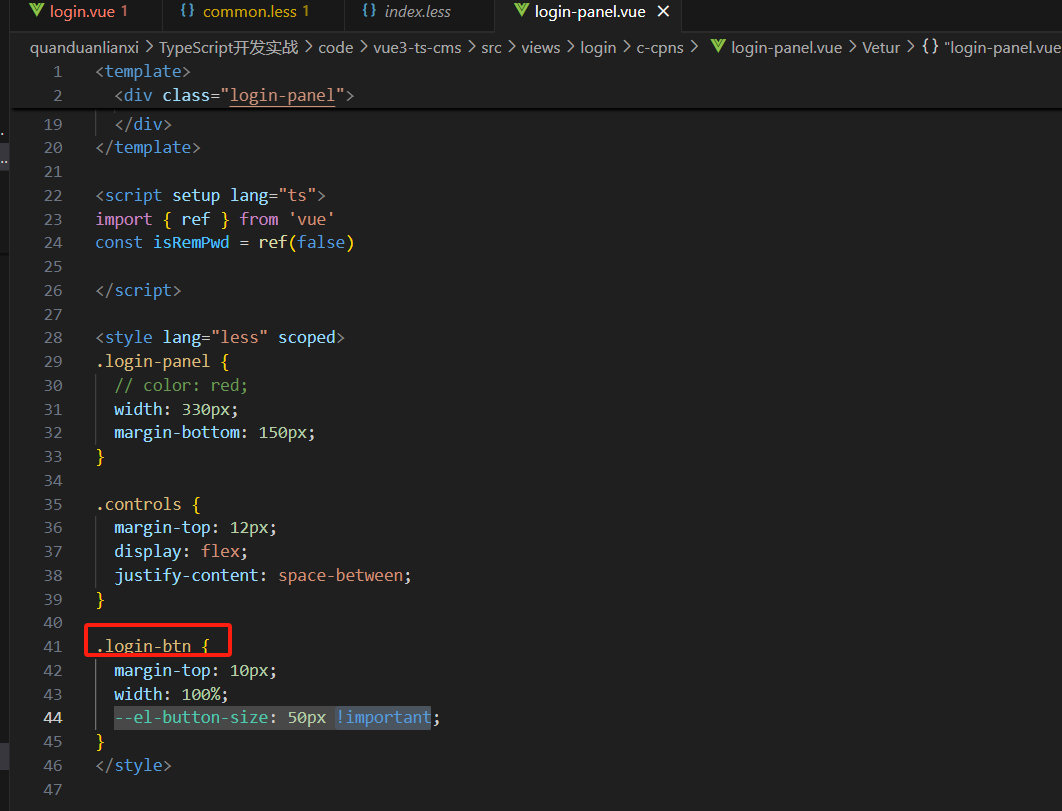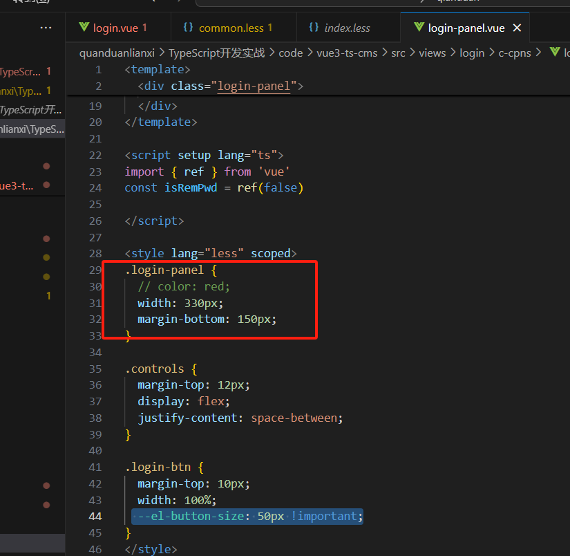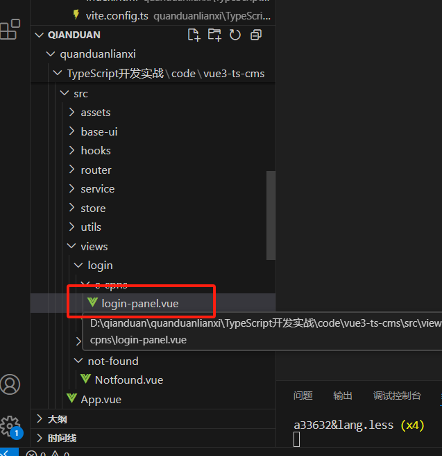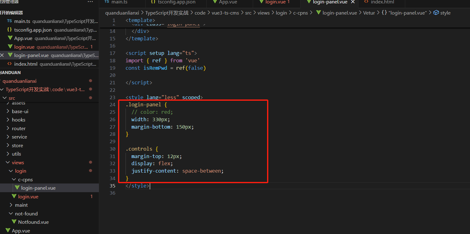<script setup lang="ts">表示使用了组合式 API 语法糖,并且使用 TypeScript 编写。import LoginPanel from './c-cpns/login-panel.vue'语句将login-panel.vue文件中的LoginPanel组件导入到当前组件中,这样在模板部分就可以使用<login-panel />来渲染该子组件。