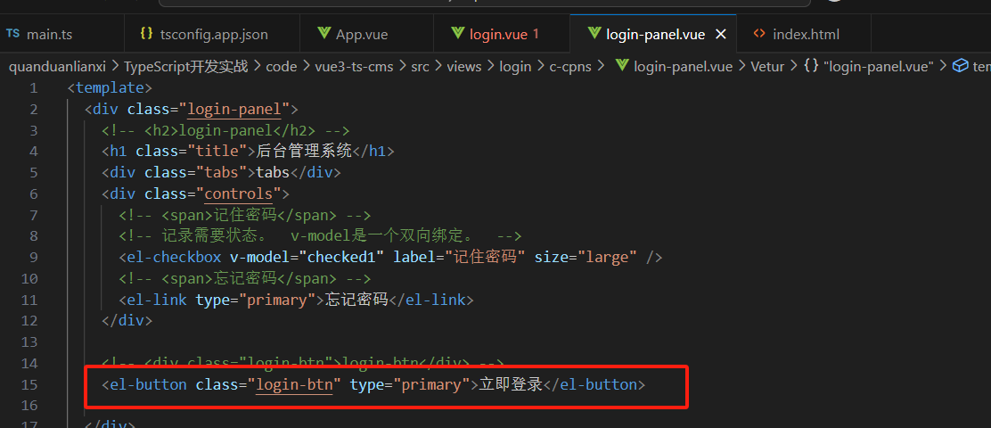 login-panel.vue这个 页面银入到当前文件中,以便后续可以使用LoginPanel来注册、渲染该组件。- 模板部分:
