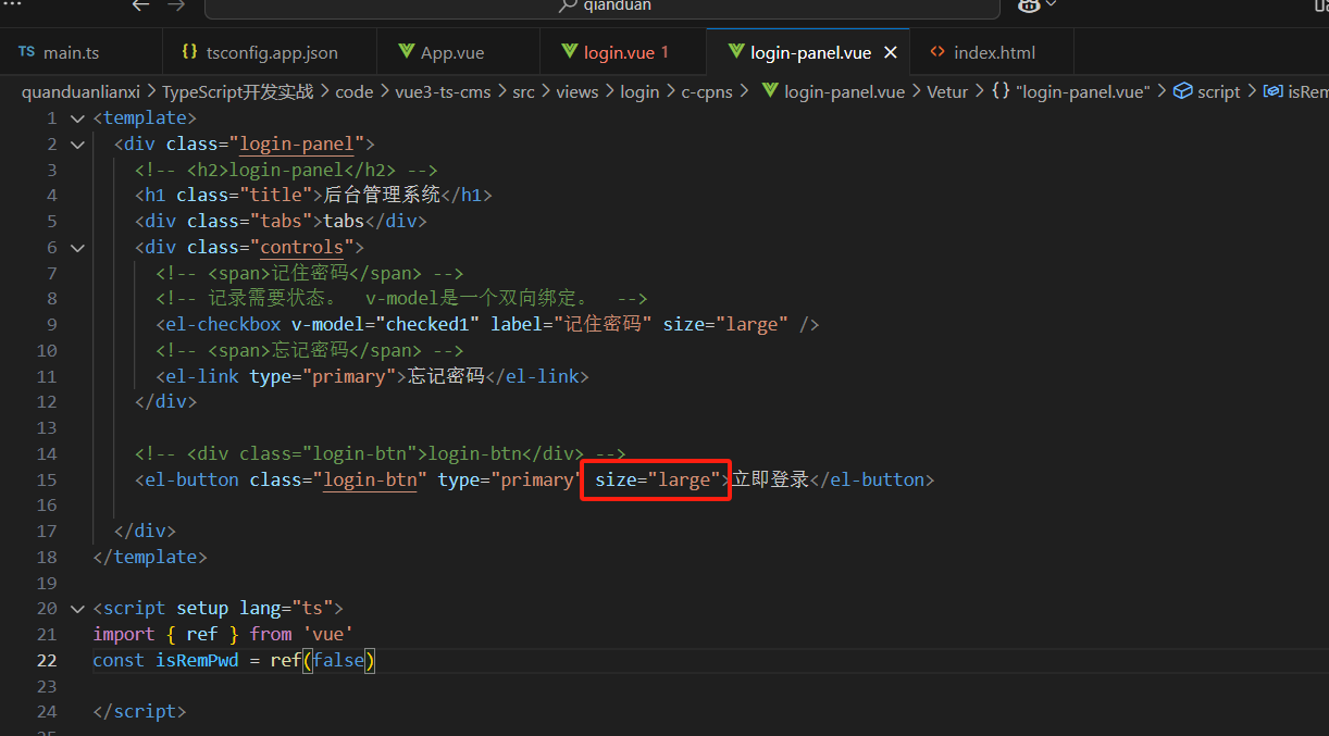 const isRemPwd = ref(false):使用ref函数创建一个名为isRemPwd的响应式引用,初始值设置为false 。isRemPwd通常可用于存储某个状态,比如对应上一张图中<el-checkbox>组件的勾选状态,用来表示是否 “记住密码”,false表示未勾选状态。 后续在组件的模板或其他方法中可以通过操作isRemPwd来改变其值,同时视图也会相应更新。