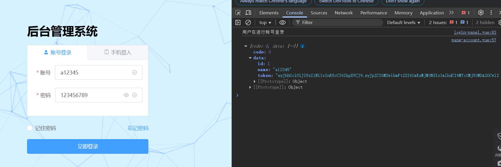 { url: '/login', data: account }:这是传递给 post 方法的配置对象,包含了请求的相关信息: