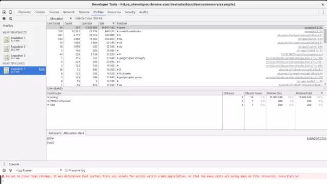 这个视图为我们呈现了一个函数的列表,同时也显示了与它们相关的内存分配情况。我们能立即看到 grow 和 createSomeNodes 凸显了出来。当选择 grow 我们看到了与它相关的对象构造函数被调用的情况。我们注意到了(string),HTMLDivElement 和 Text 而现在我们已经知道是对象的构造函数被泄露了。