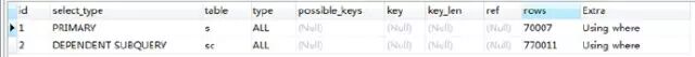这样就是相当快了啊,Mysql竟然不是先执行里层的查询,而是将sql优化成了exists子句,并出现了EPENDENT SUBQUERY,mysql是先执行外层查询,再执行里层的查询,这样就要循环70007*11=770077次。