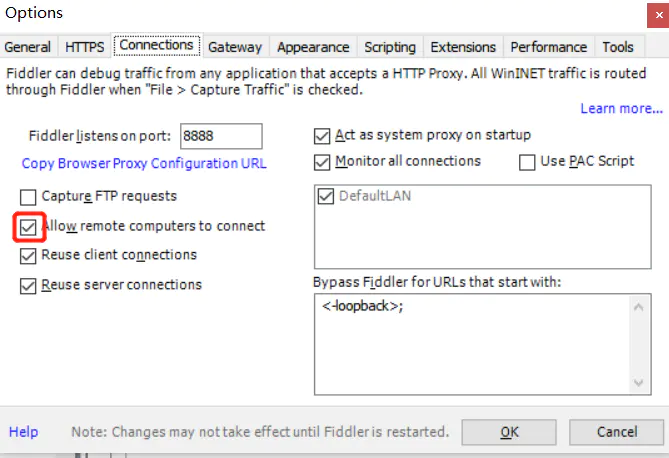 1.Fiddler设置打开Fiddler, Tools-> Options。选中"Allow remote computers to connect". 是允许别的机器把HTTP/HTTPS请求发送到Fiddler上来(配置完后记得要重启Fiddler)。