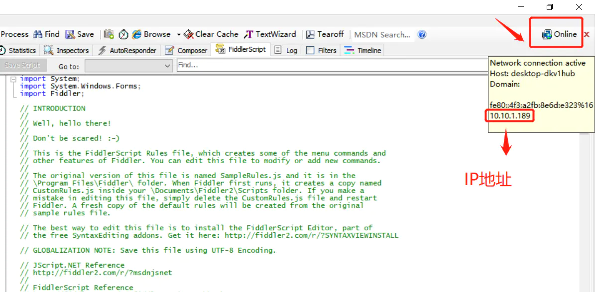 2.获取电脑ip地址:cmd输入ipconfig,或者直接通过fiddler查看,鼠标放在fiddler界面右上角网络连接图标处,即可展示本机ip(如图)。