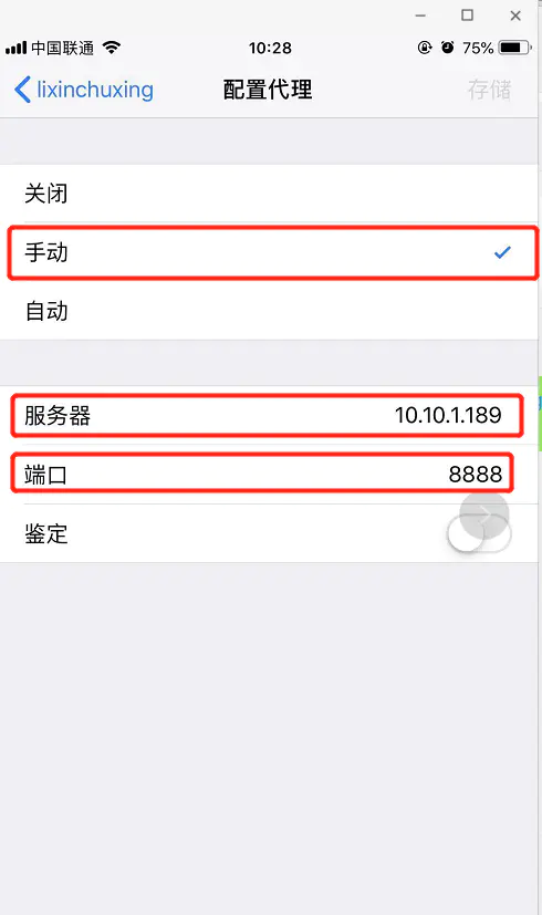 3.打开手机, 找到你的无线网络连接, 打开HTTP代理,选择"手动", 输入Fiddler所在机器的IP地址(比如:192.168.1.104) 以及Fiddler的端口号8888