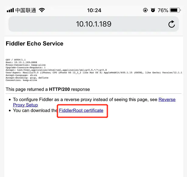 4.手机安装证书:首先要知道Fiddler所在的机器的IP地址,手机浏览器访问“ip地址:8888”,FiddlerRoot certificate" 然后安装证书并设置信任。