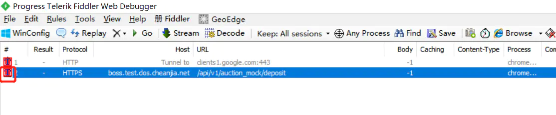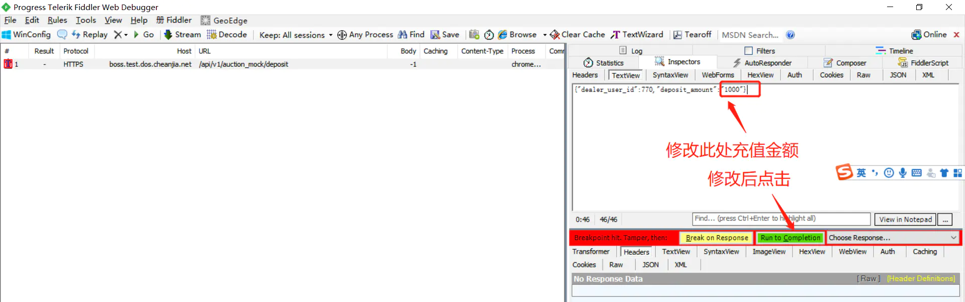 输入充值金额,提交前,进行断点设置,fiddler中选中Rules->Automatic Breakpoints->Before Requests;页面进行业务操作,此时在fiddler页面可以看见对应的请求图标会有个红色通行标示,表示请求过程中设置了断点,客户端发出的请求被fiddler拦截了。