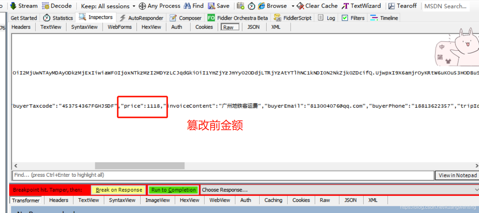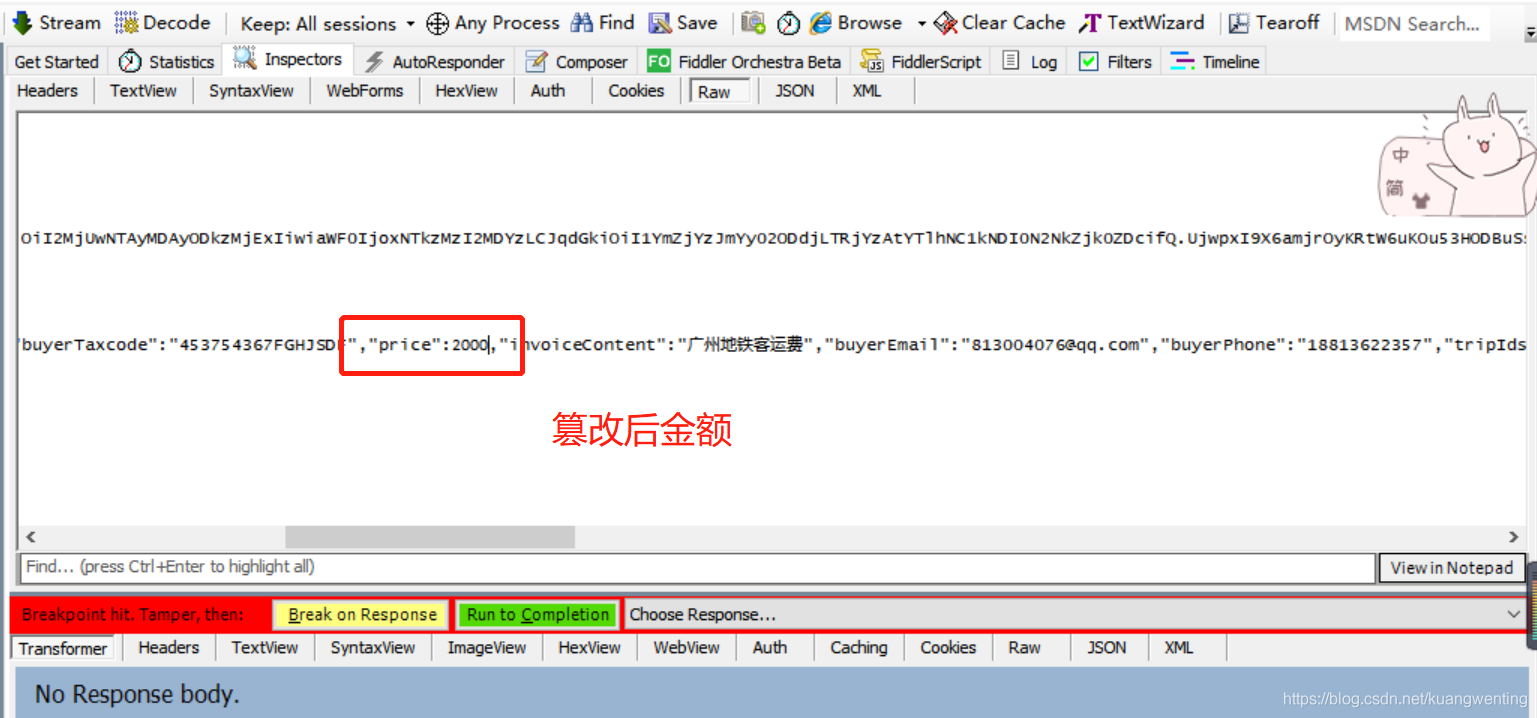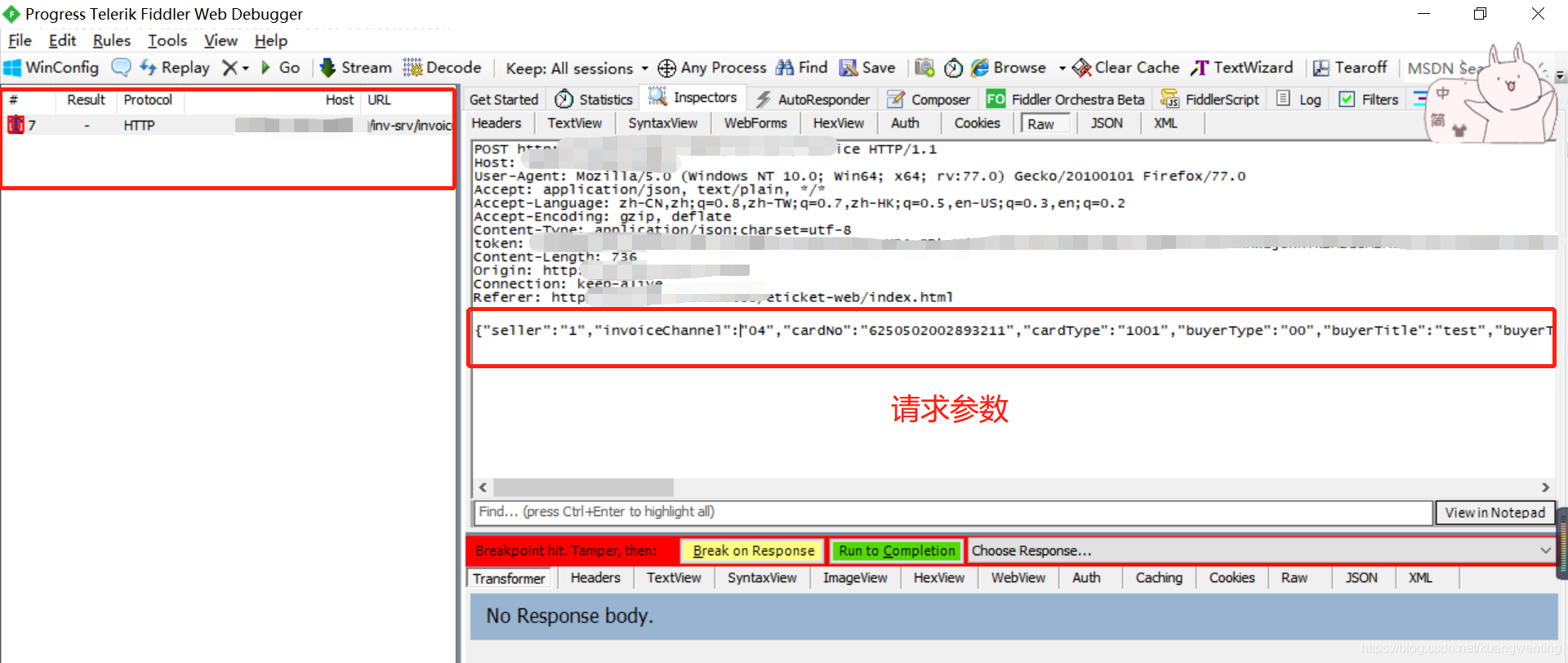 步骤5:fiddler会话列表中,可以看到这个请求已经被设置了请求前断点,点击该会话,在右侧请求参数中,篡改开票金额