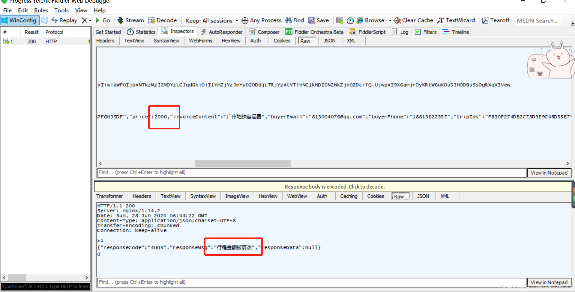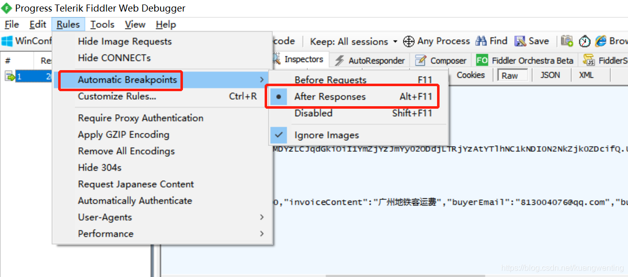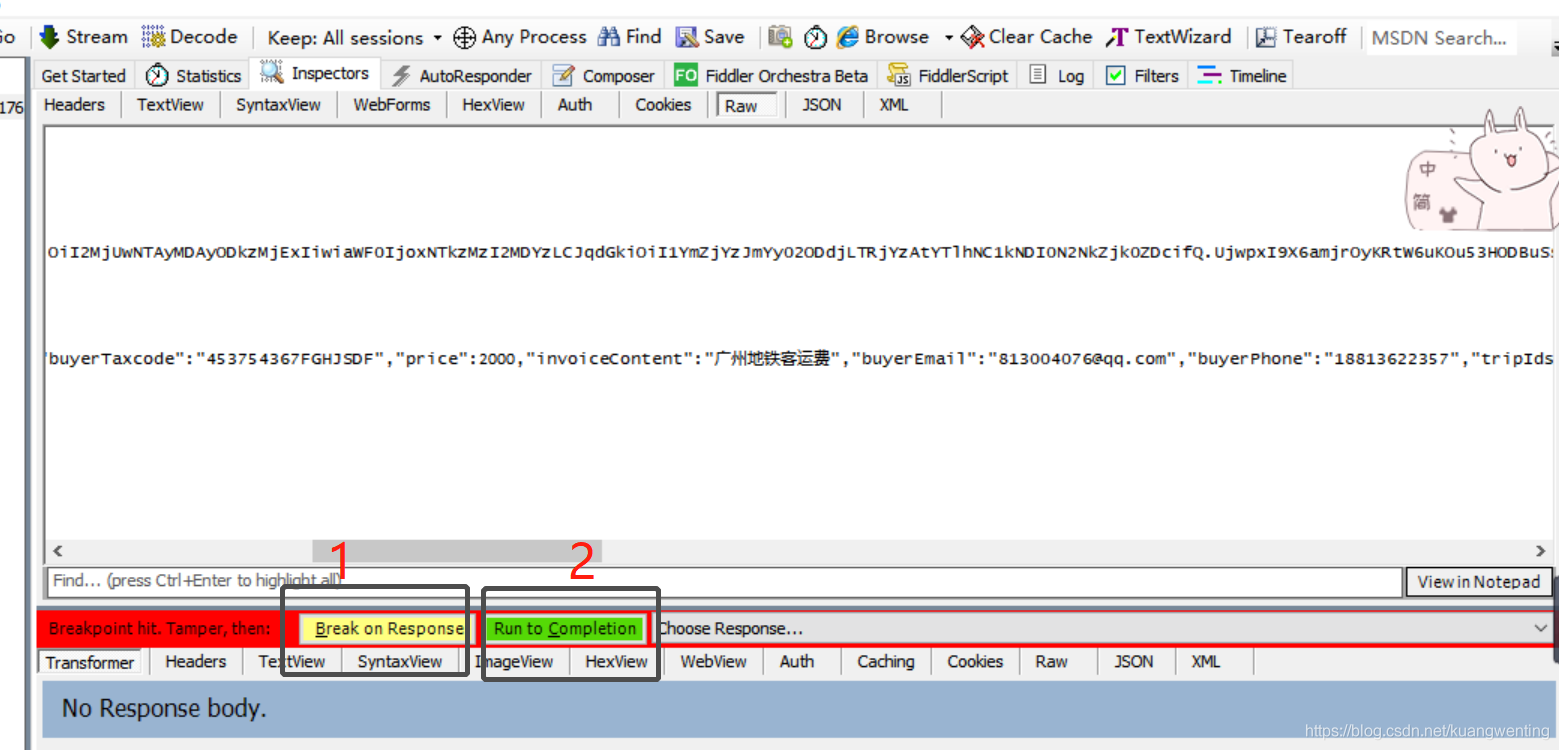 步骤5:fiddler会话列表中,可以看到这个请求已经被设置了请求前断点,点击该会话,在右侧请求参数中,篡改开票金额