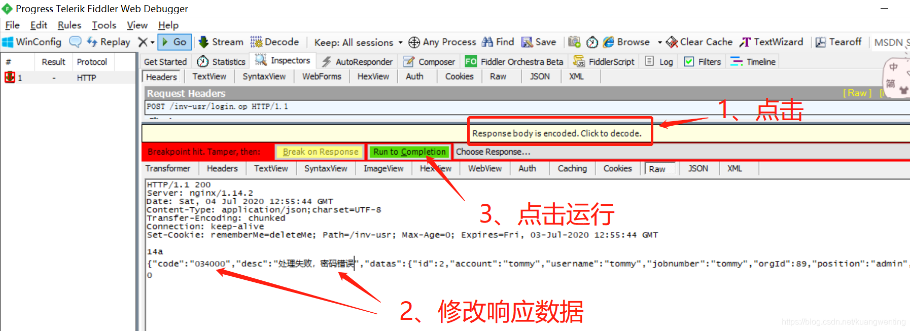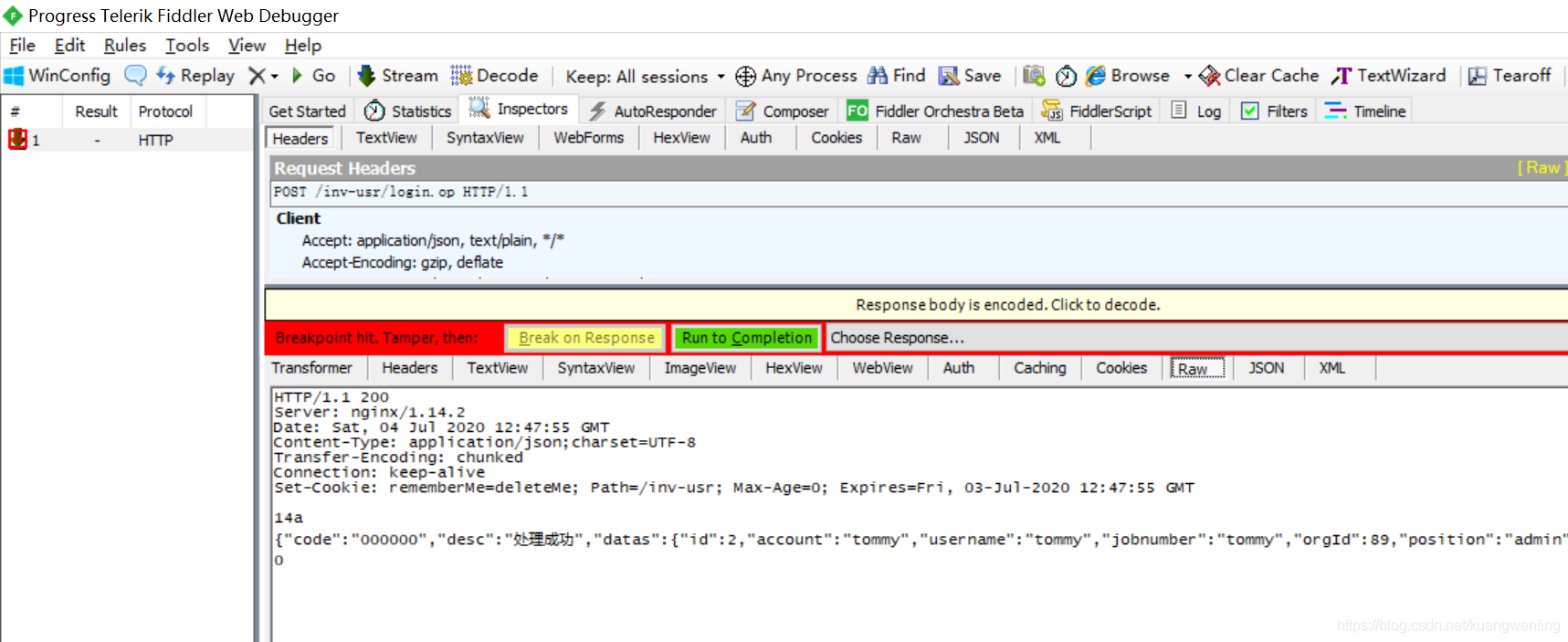 先打开目标网址进行登录,然后将fiddler拦截的登录成功的响应信息进行修改