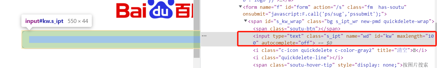 以百度首页搜索框为例,查看元素信息如下图所示: