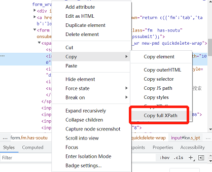 以百度搜索框元素为例,鼠标单机右键-Copy-Copy full XPath即可获取其XPath绝对路径。