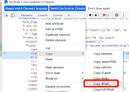 以百度搜索框元素为例,鼠标单机右键-Copy-Copy XPath即可获取其XPath相对路径。