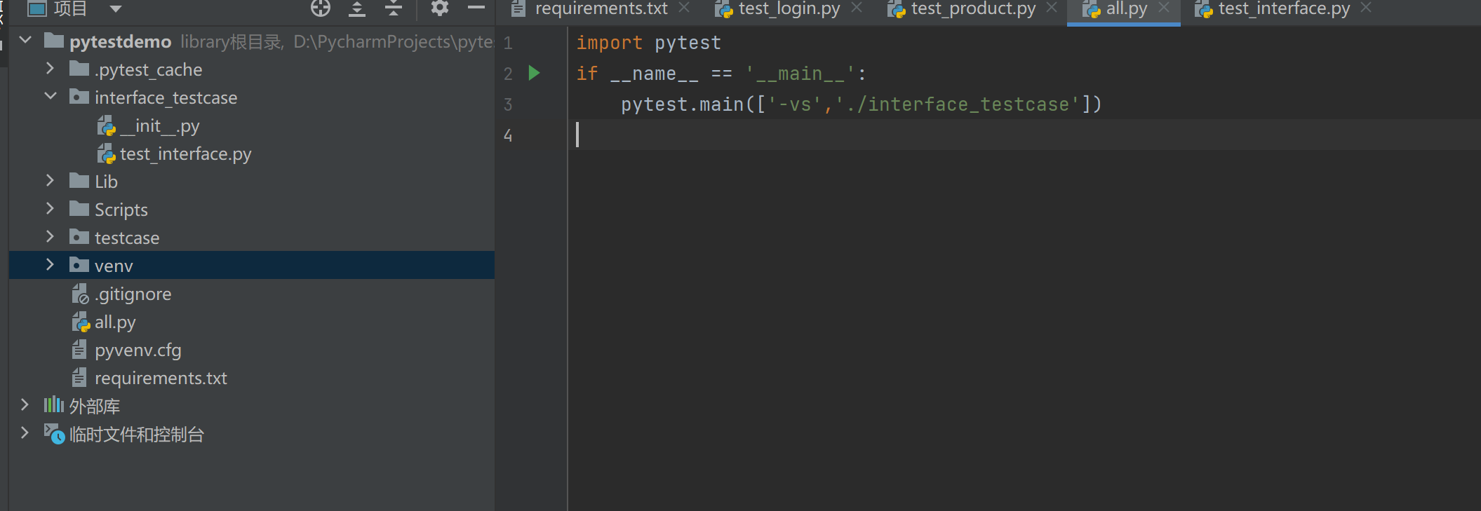 将all.py放在最外面,又创建了一个interface_testcase这个包,包里面是一个test_interface.py模块,模块下,创建了类和方法。