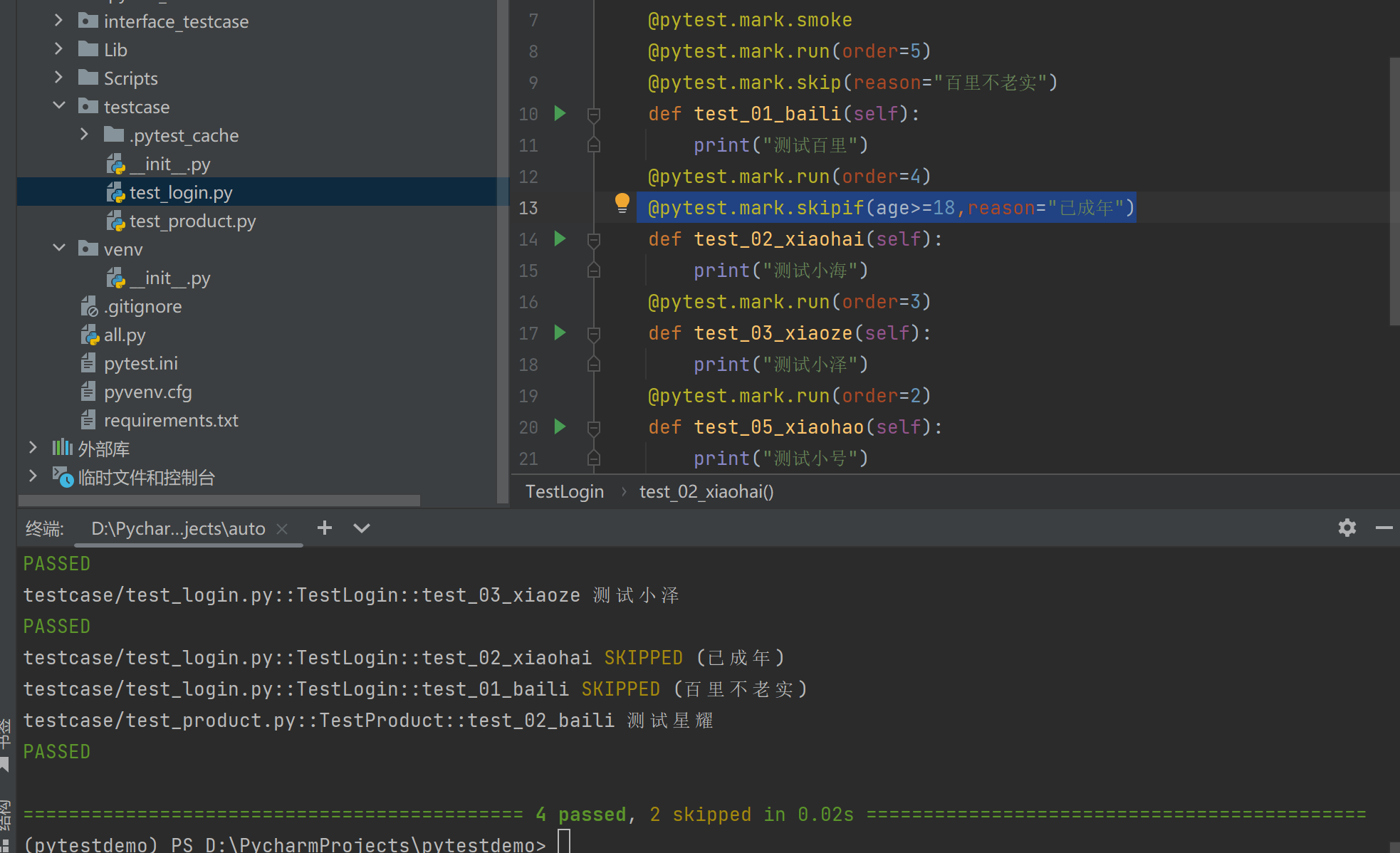 @pytest.mark.skipif(age>=18,reason="已成年")