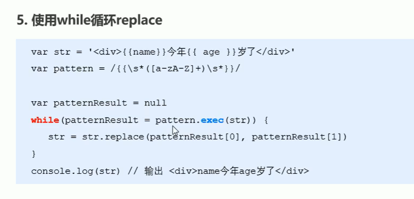 //语法:exec(arr) //示例 var str='<div>我是{{name}}</div>' var pattern=/{{[a-zA-Z]+}}/