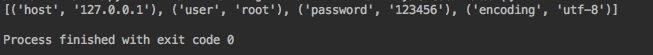 path = os.path.dirname(os.getcwd()) configpath = os.path.join(path, 'config/conf.ini') cfg = configparser.ConfigParser() cfg.read(configpath) key=cfg.items('database') print(key)