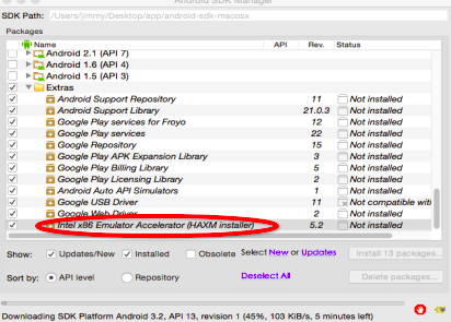 ① 在终端进入下载的Android sdk 的tools目录,然后输入./android sdk 请出SDK Manager的图形界面