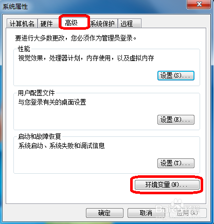 3、点击高级,在点击环境变量,弹出环境变量,在系统变量下选择“新建”(如果已经新建过的,可以单击“编辑”)