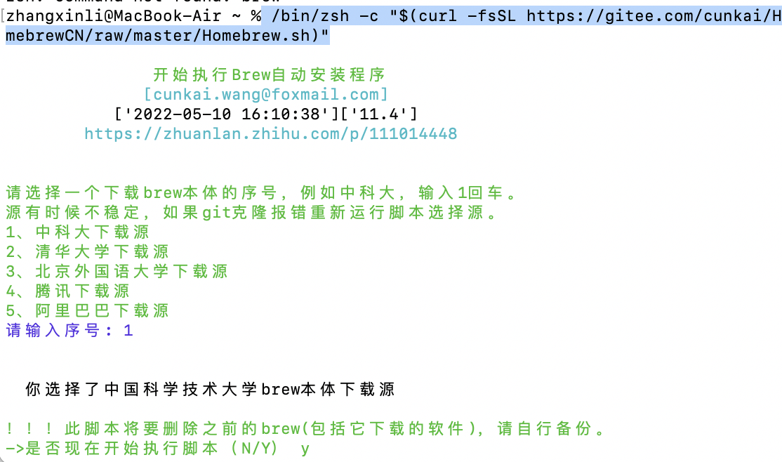 1、安装brew,下面安装的是国内的镜像,我选择的中科大