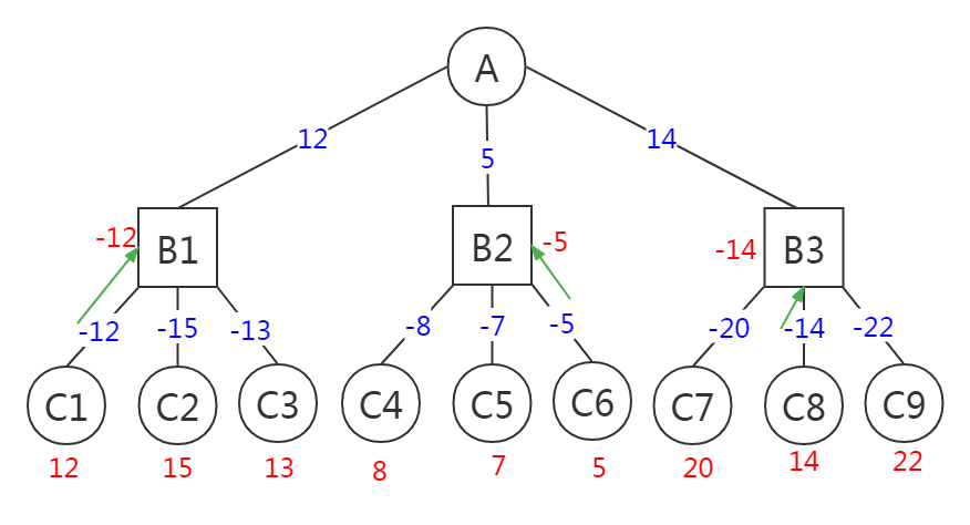 黑方在B1、B2、B3分别取得了-12、-5、-14的优势,对于红方来讲,则在这三个点分别有12、5、14的优势。所以在A点,轮到红方走棋,它会在B1、B2、B3中选择最大值,即:max(12, 5, 14),这里看出A的选择了吗?