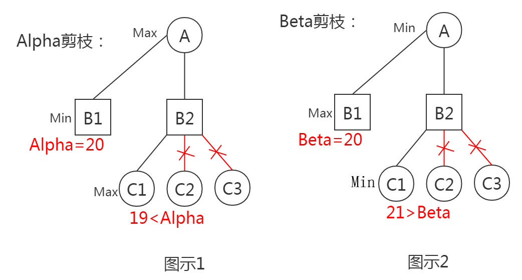 从图示上看,Alpha剪掉比自己的小的分枝,Beta减掉比自己大的分枝,关键点在于Alpha-Beta搜索必须进行排序。