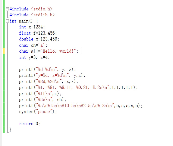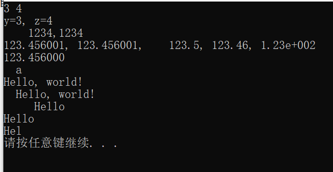 小结:%d:输出整数值,%d前面有什么照样输出,%d前面加数字表示该数据一共占多少位,若位数不够,则前面加空格占位,若数据位数多于要求,则直接输出原数据