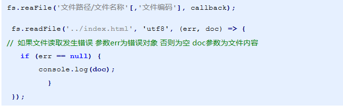 ② 使用系统模块的方法 fs.reaFile('文件路径/文件名称'[,'文件编码'], callback); //[]可选参数 callback 回调函数