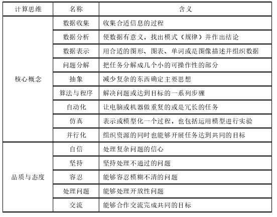 美国麻省理工MIT实验室的Karen Brennan 和Mitchel Resnick基于Scratch 教学实践,将计算思维从实践的角度分为计算概念、计算实践、计算观念14。中国学者王飞跃基于Karen Brennan 和Mitchel Resnick的观点,将计算思维概括为以抽象、算法和规模为特征的解决问题的思维方式。