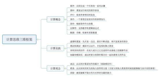 •计算思维三维框架:该框架涉及三个关键维度:计算概念、计算实践和计算观念。