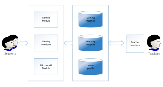“ Speedy World”由游戏模块,游戏界面和微世界模块组成。 三个数据库用于存储游戏资料,学习资料和学习者资料。 游戏界面负责通过调用游戏模块按照游戏故事情节与学生进行互动。 当游戏故事情节到达解决问题的任务点时,游戏模块将调用微世界模块以启动交互式问题场景模拟过程。 另外,提供了教师界面,以使教师或系统管理员能够修改游戏或学习内容。