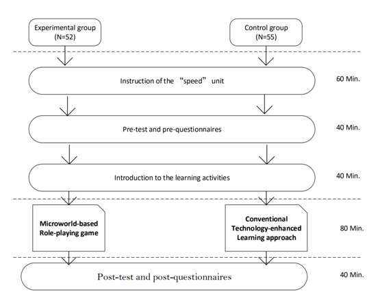 研究采用准实验设计,其中将来自2个类别的107个六年级学生分为1个实验组和1个对照组。 具有52名学生的实验组采用了基于微世界的游戏学习活动,而具有55名学生的对照组则采用了传统的技术增强学习方法。