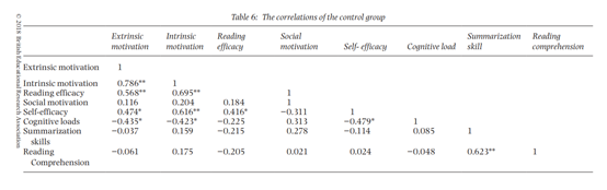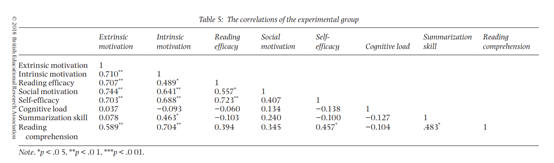 学生的认知负荷、阅读动机、自我效能感、阅读理解和总结能力与实验组学生的内在动机与其他变量显著相关。外在动机与阅读成绩、自我效能和阅读理解显著相关。