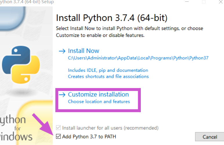 安装的时候选择第二项自定义安装,并且勾选Add Python 3.7 to PATH(会自动将解释器添加到环境变量),自定义安装的目录最后是根目录,比如D:\Python37,这样方便后续寻找。